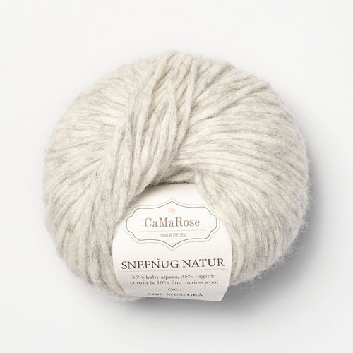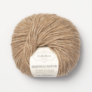 SNEFNUG NATUR on superpehmeä, kevyt, ilmava ja täyteläinen lanka, joka on valmistettu vain luonnollisista materiaaleista. Langan sekoituksessa on 55 % värjäämättömiä alpakkakuituja, 10 % merinovillaa (mulesing-vapaata) ja 35 % luomupuuvillaa.