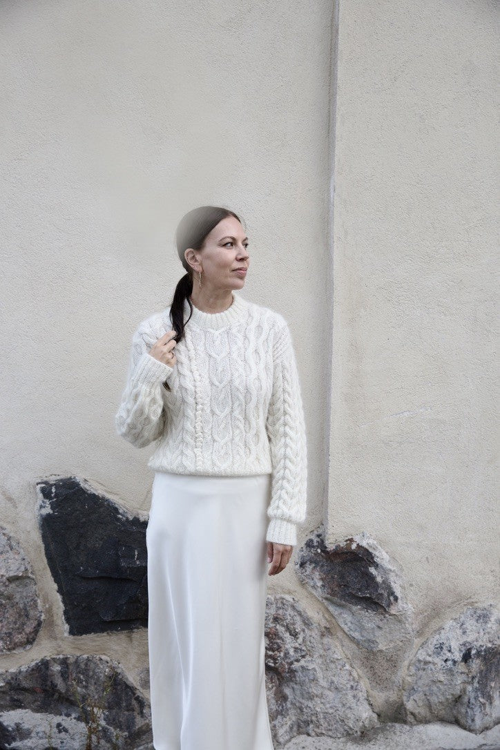 Nyt painellaan palmikoita oikein urakalla! Crèmelle-pusero on kuin koristeellinen kermakuorrutus, jonka kuohkeat palmikot vaihtuvat epäsymmetrisesti edessä ja takana. Hihoissa saa huilata, sillä niissä neulotaan vain yhtä kuviota – toki nekin ovat eripariset.
