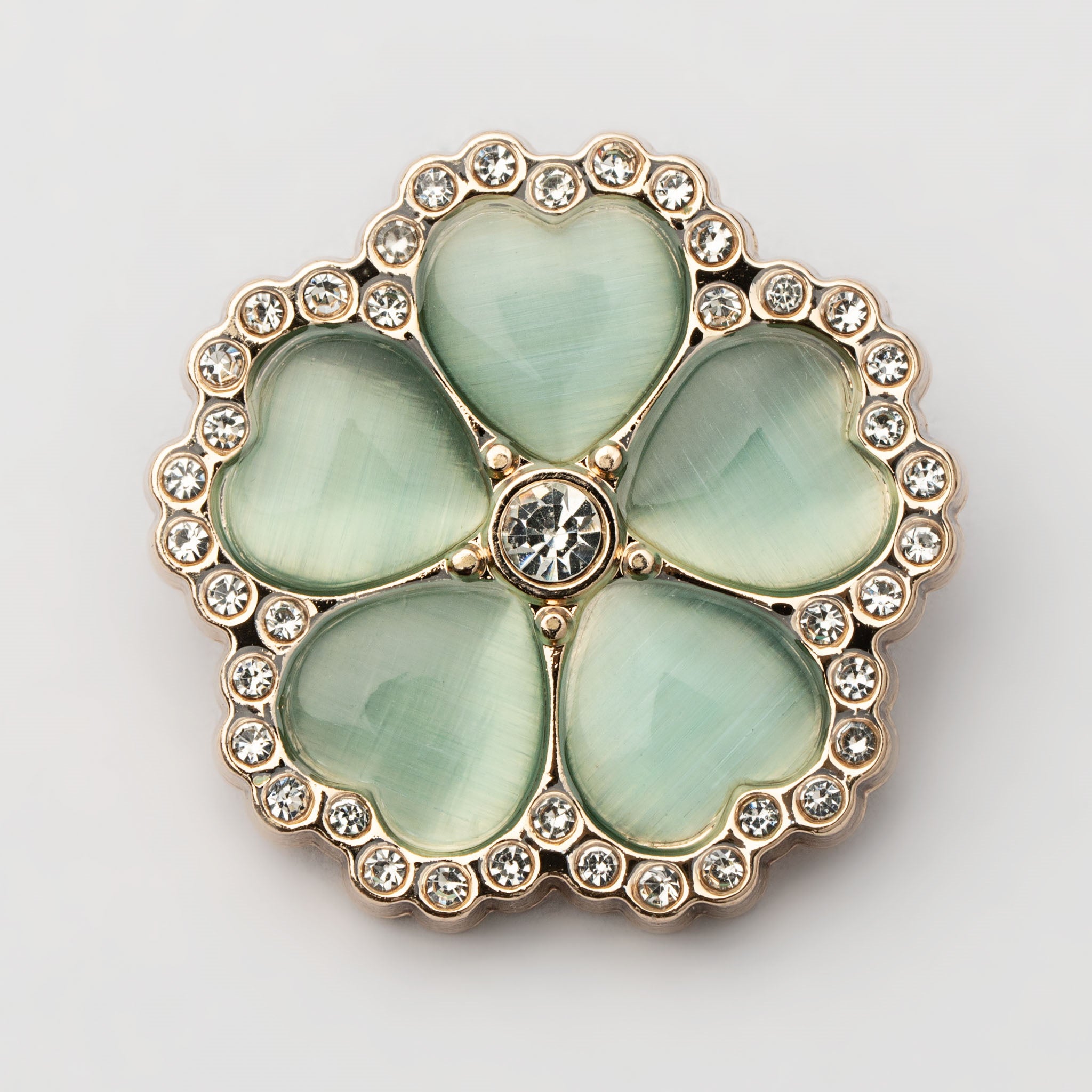 Näillä helmiäisen ja timantinhohtoisilla koristenapeilla viimeistelet neuletakkisi ja teet siitä katseenvangitsijan. Napit muistuttavat pieniä vaalean vihertävän sävyisiä kukkia. Napit ovat halkaisiljaltaan 25 mm kokoiset ja metalliosat kullansävyiset.