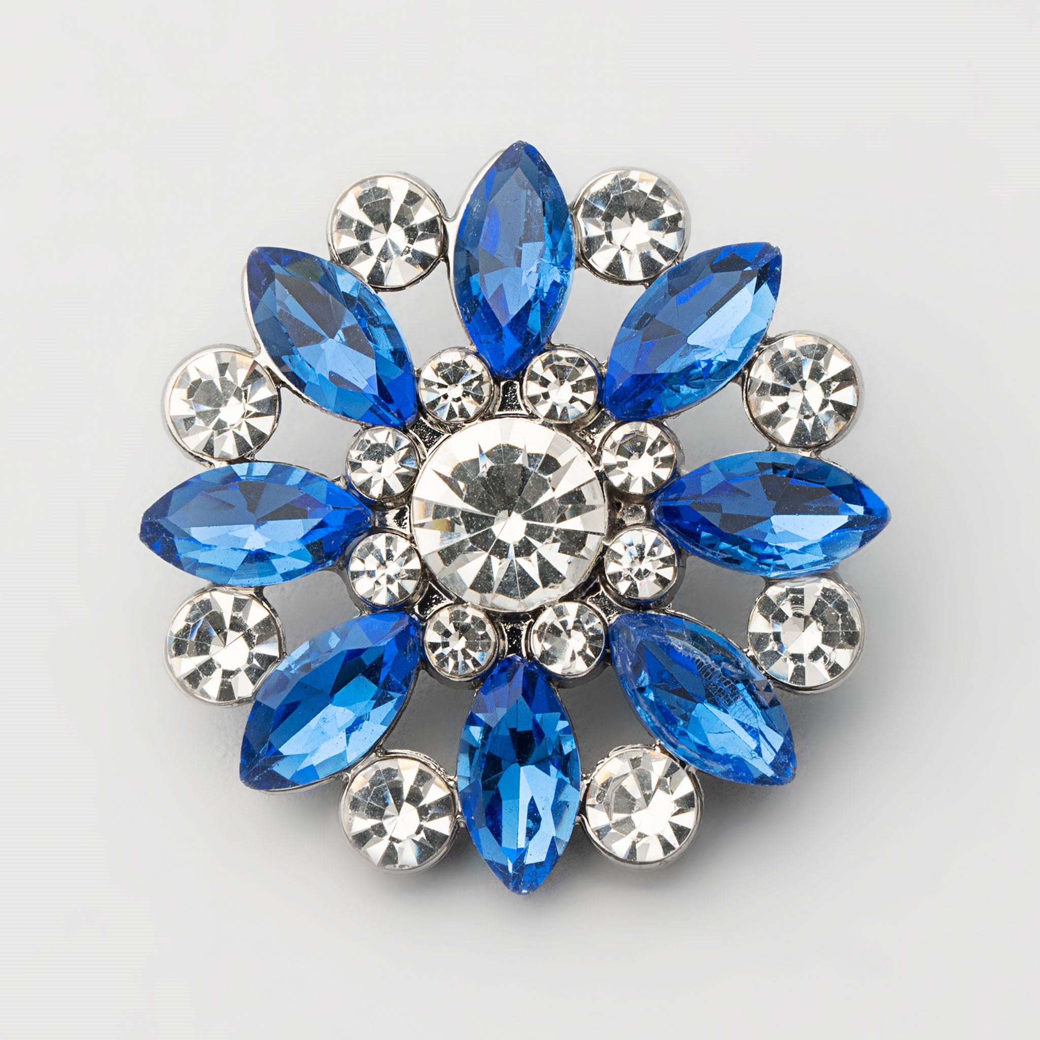 Näillä vaaleankirkkaan ja sinisen värisillä timantinhohtoisilla koristenapeilla viimeistelet neuletakkisi. Nappi muistuttaa kukan kukintoa ja siinä on isompia ja pienempiä koristekiviä. Nappi on halkaisiljaltaan n. 25 mm kokoinen ja metalliosat ovat hopeansävyiset.