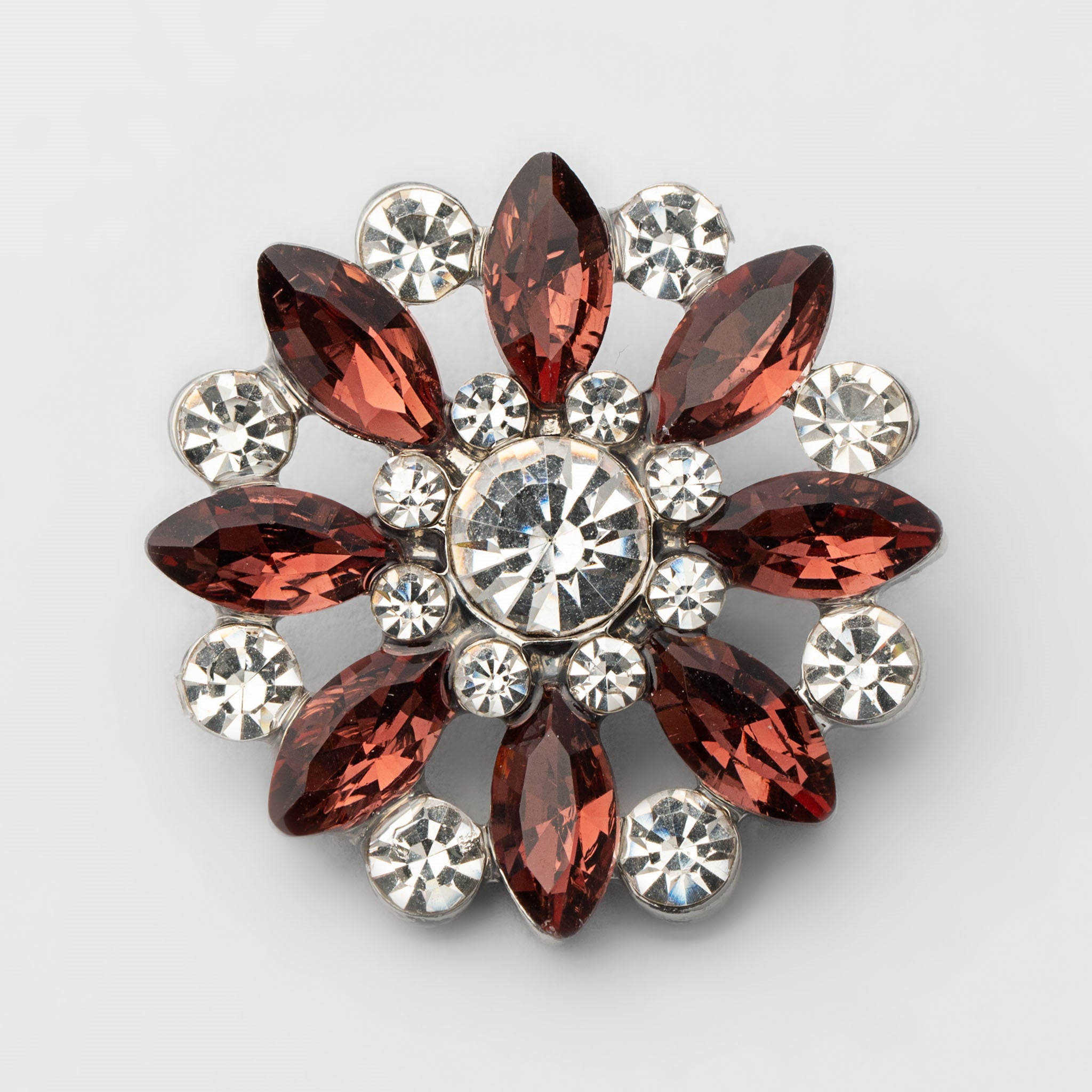 Näillä vaaleankirkkaan ja rusehtavan värisillä timantinhohtoisilla koristenapeilla viimeistelet neuletakkisi. Nappi muistuttaa kukan kukintoa ja siinä on isompia ja pienempiä koristekiviä. Nappi on halkaisiljaltaan n. 25 mm kokoinen ja metalliosat ovat hopeansävyiset.