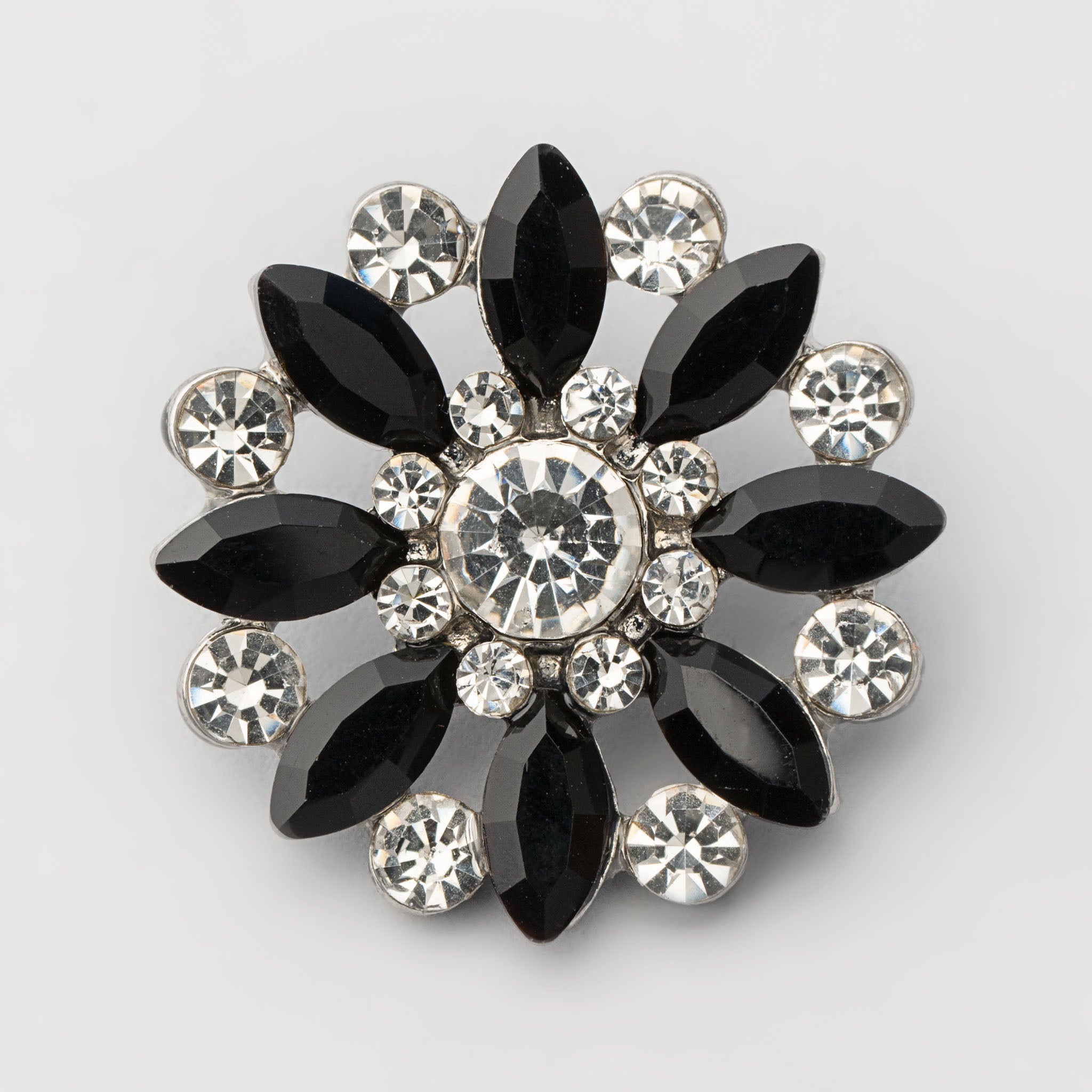 Näillä mustan ja kirkkaan värisillä säkenöivillä koristenapeilla viimeistelet neuletakkisi. Nappi muistuttaa kukan kukintoa ja siinä on isompia ja pienempiä koristekiviä. Nappi on halkaisiljaltaan n. 25 mm kokoinen ja metalliosat ovat hopean sävyiset.