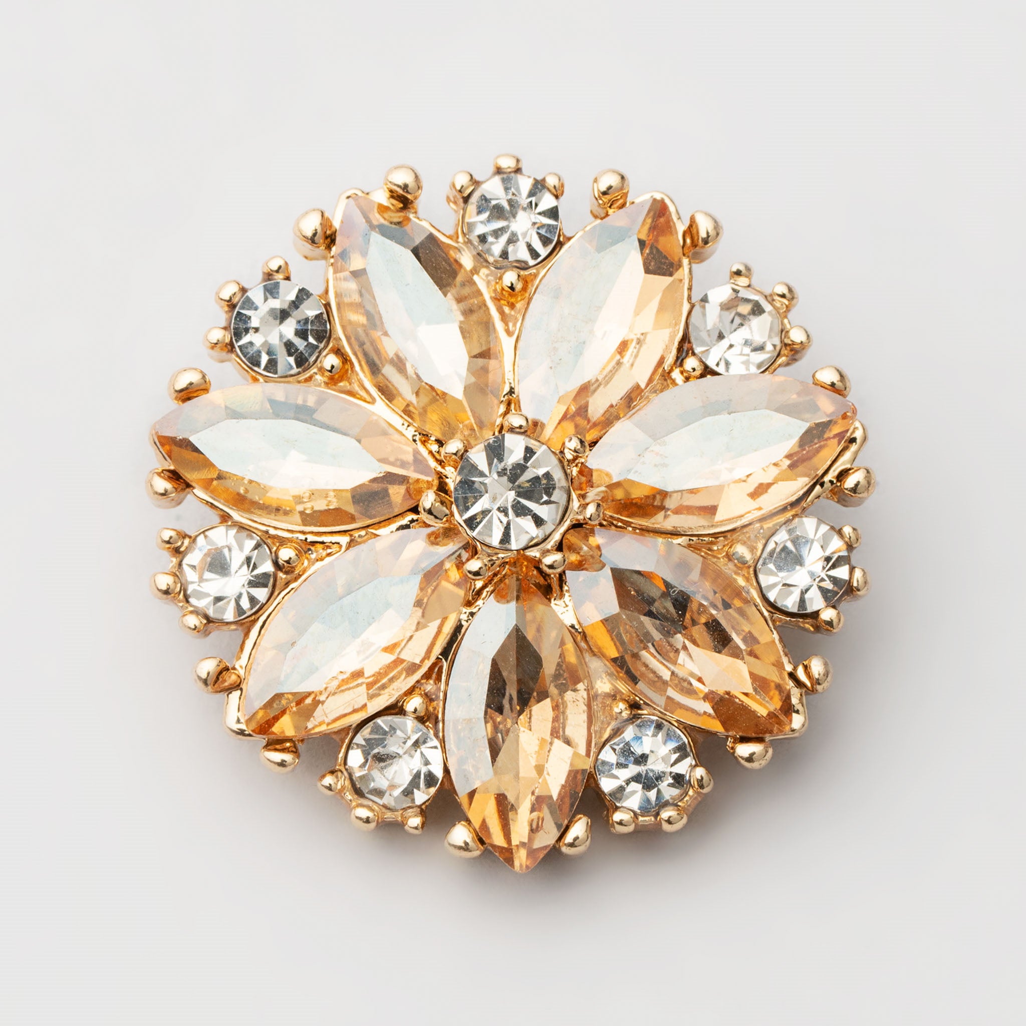 Näillä vaaleankirkkaan ja aprikoosin värisillä timantinhohtoisilla koristenapeilla viimeistelet neuletakkisi. Napissa on isompia värikkäitä koristekiviä sekä pienempiä kirkkaanvaaleita ja pyöreitä. Metalliosat ovat kullansävyiset. Nappi on halkaisiljaltaan n. 25 mm.
